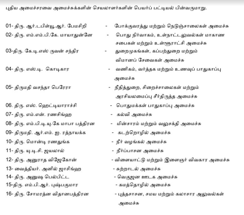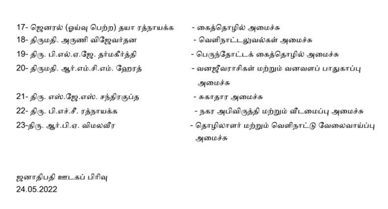 Primary NewsSri Lanka இருபத்தி மூன்று அமைச்சுகளுக்கு புதிய செயலாளர்கள் நியமனம் By globe tamil - May 24, 2022 0 308 FacebookTwitterPinterestWhatsAppEmailPrint Article Top Ad ஜனாதிபதி கோட்டாபய ராஜபக்ஷவினால் 23 புதிய அமைச்சின் செயலாளர்கள் இன்று நியமிக்கப்பட்டுள்ளனர். ஜனாதிபதியின் உத்தியோகபூர்வ இல்லத்தில் இடம்பெற்ற நிகழ்வின் போதே ஜனாதிபதி அவர்களுக்கான நியமனக் கடிதங்களை வழங்கினார்.