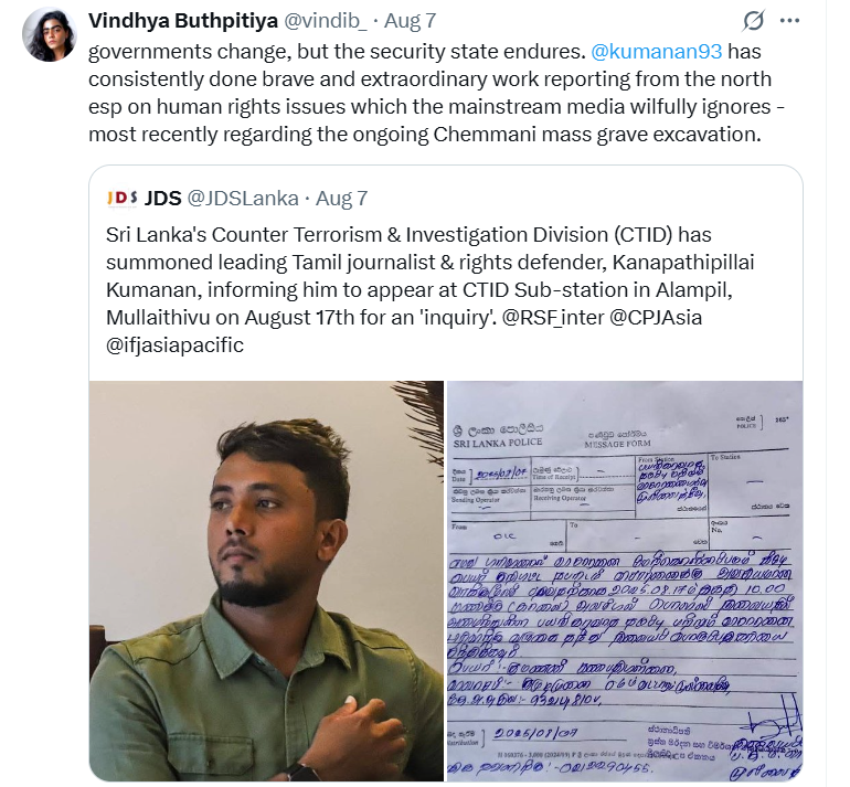 இந்த அரசாங்கத்தின் கீழும் ஊடகவியலாளர்கள் தொடர்ந்தும் துன்புறுத்தப்படுவதாக அவர் X தளத்தில் இட்டுள்ள பதிவில் மேலும் சுட்டிக்காட்டியுள்ளார்.